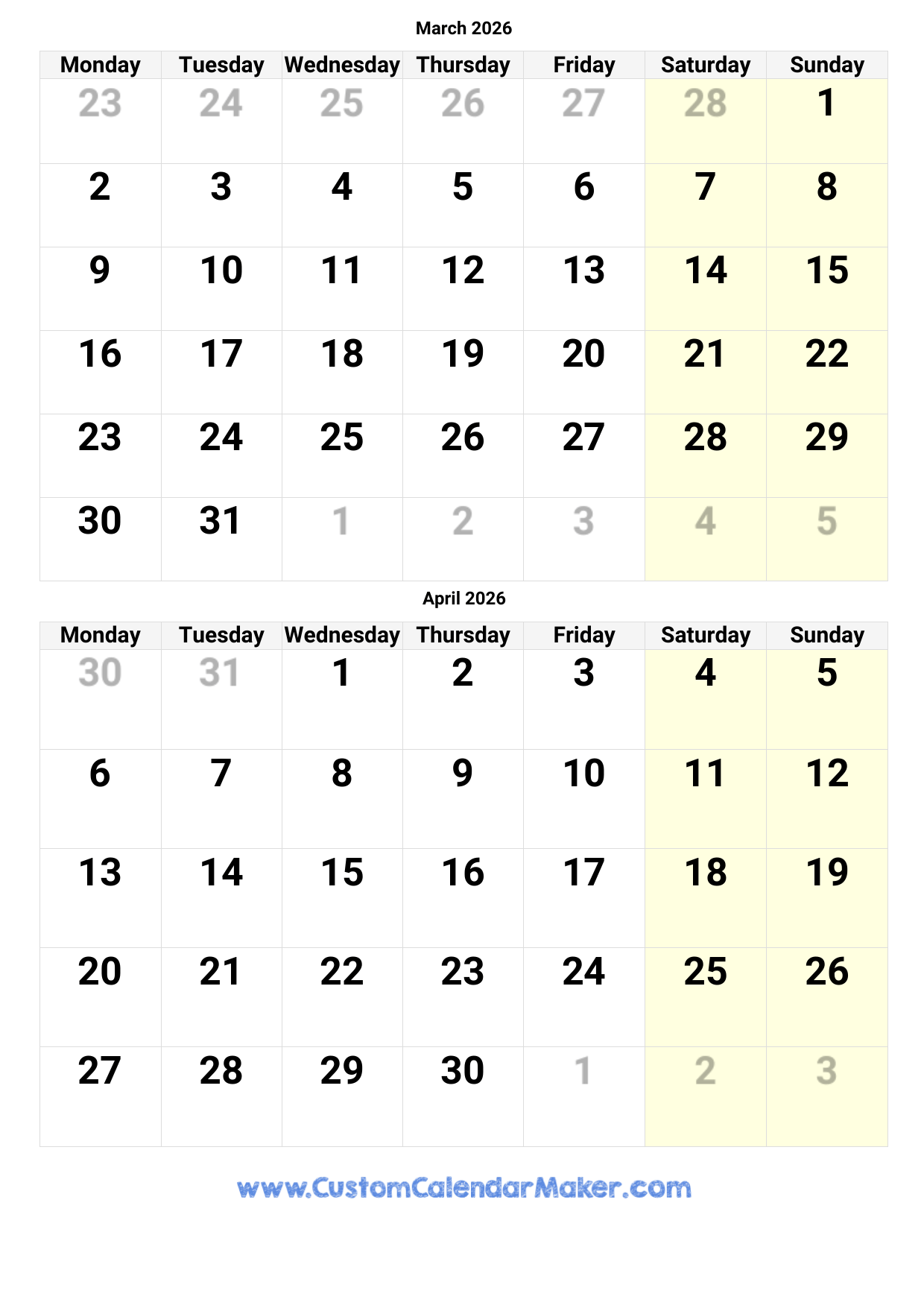 March And April 2026 Calendar Printable PDF 2 Month Calendar Template