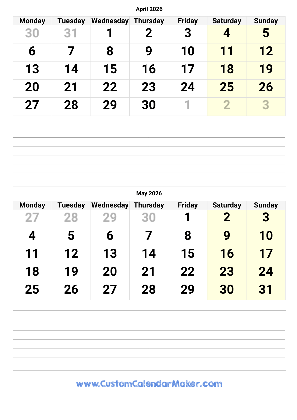 April And May 2026 Calendar Custom Calendar Maker