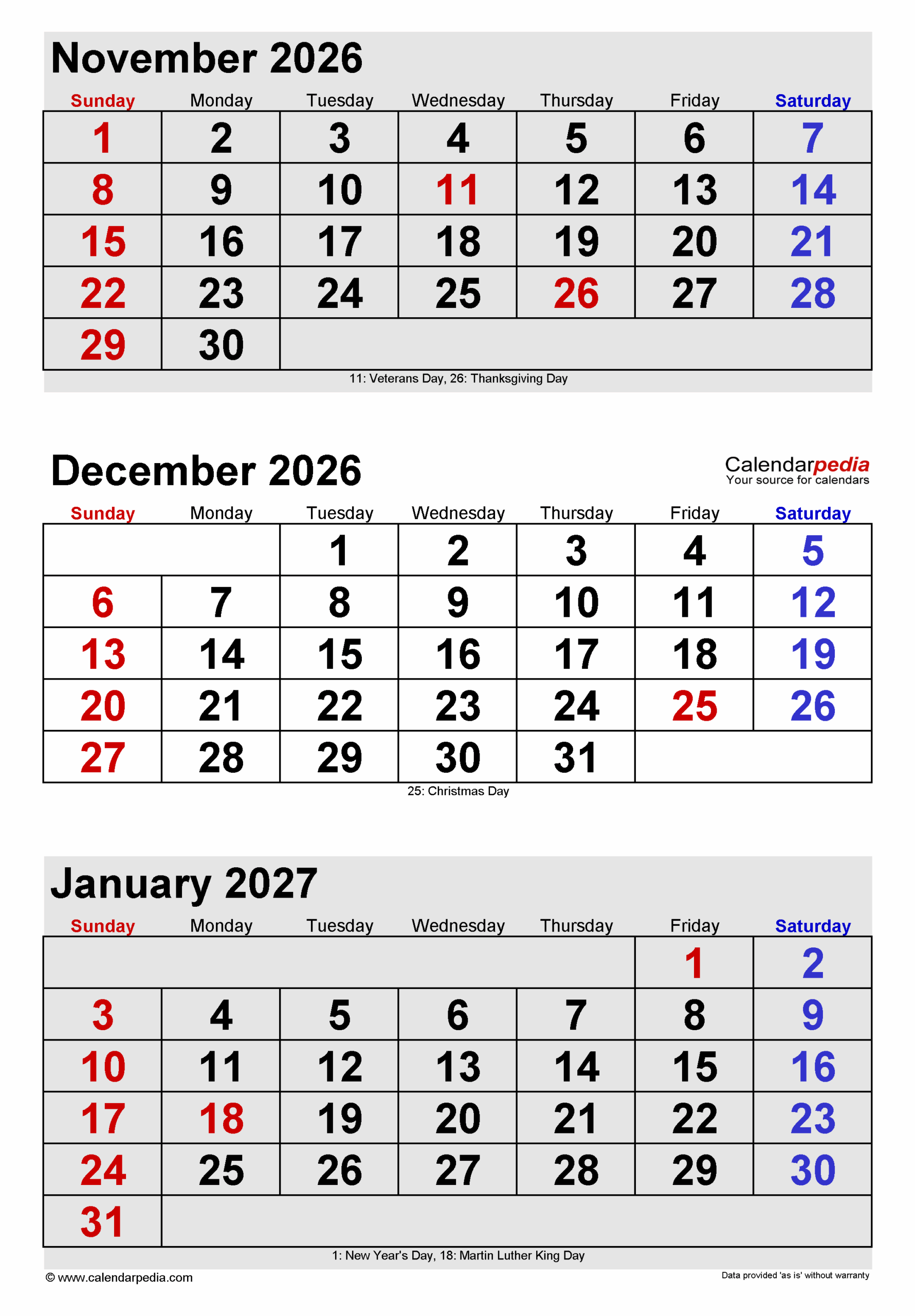 November To January 2026 Calendar Printable PDF Three Months Calendar