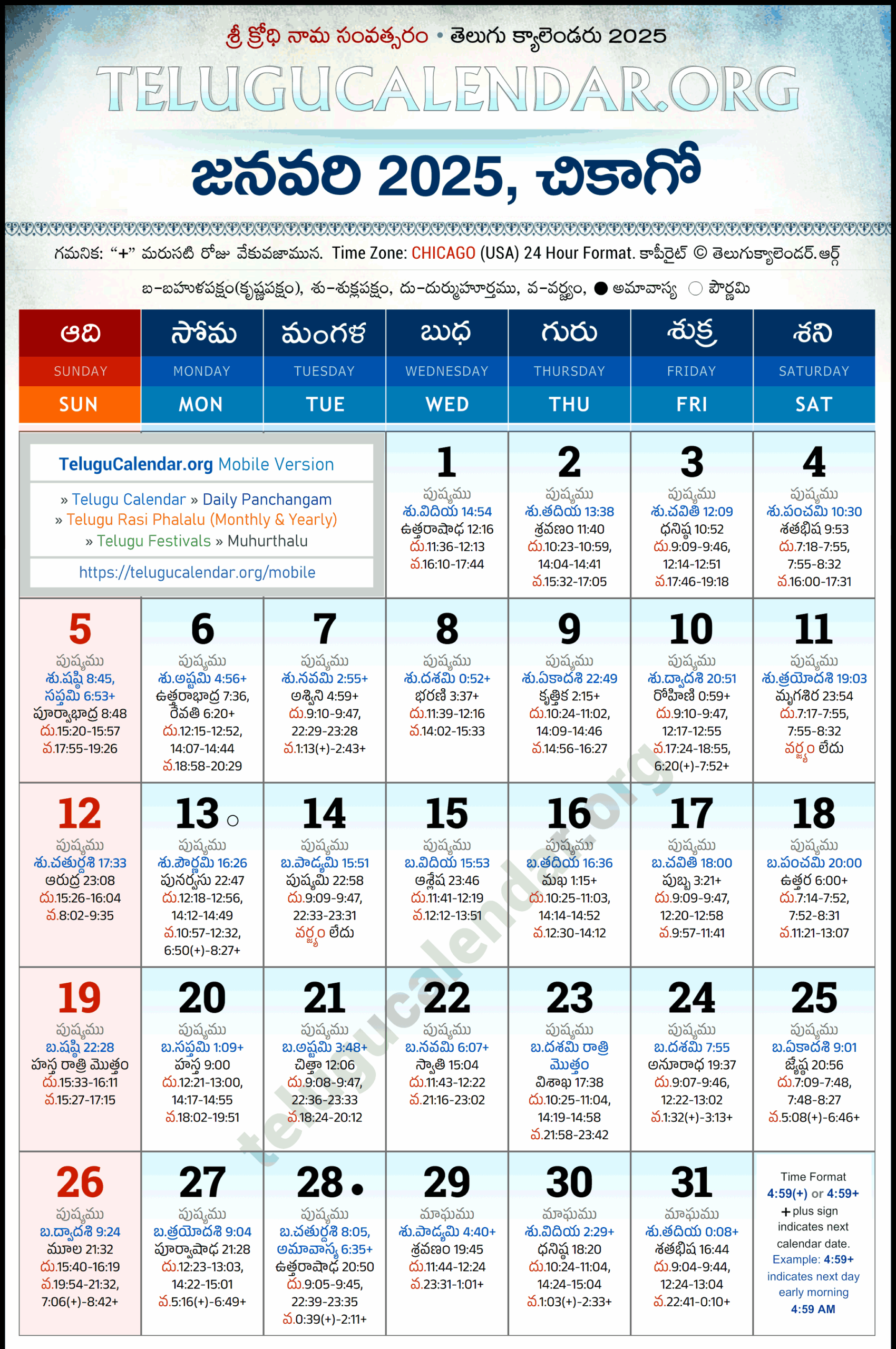 Chicago Telugu Calendar 2026 January
