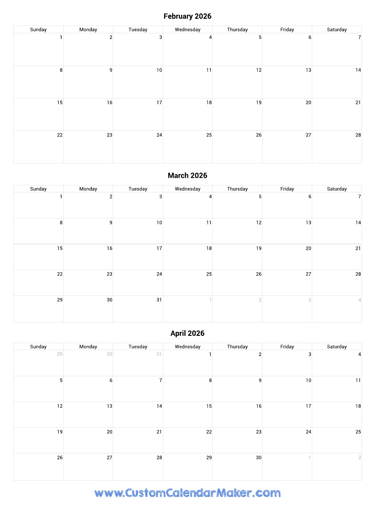 February To April 2026 Calendar Printable Custom Calendar Maker