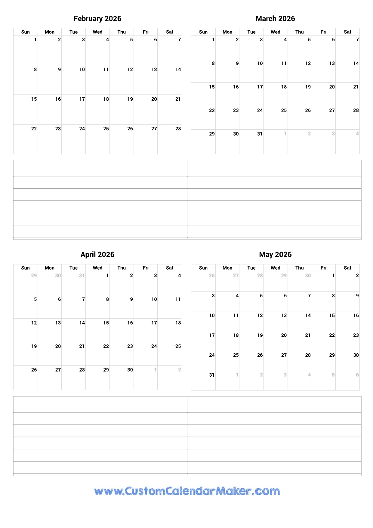 February To May 2026 Printable Calendar Custom Calendar Maker