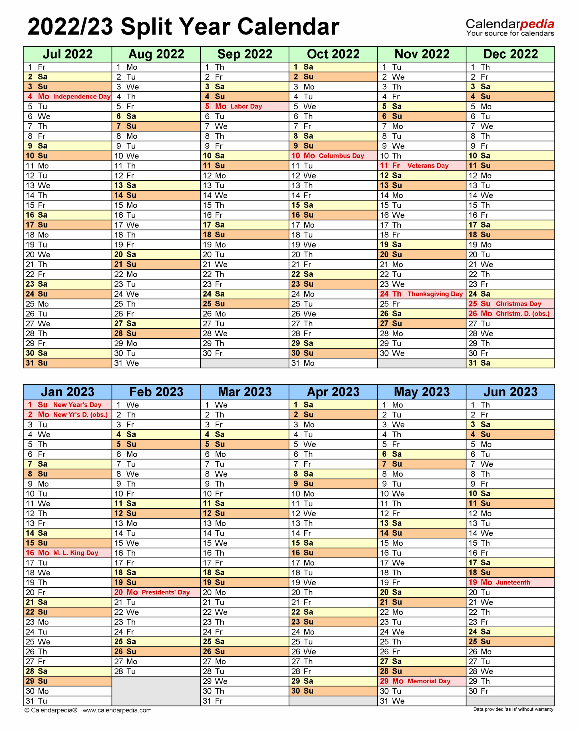 Split Year Calendars 2022 2023 July To June PDF Templates