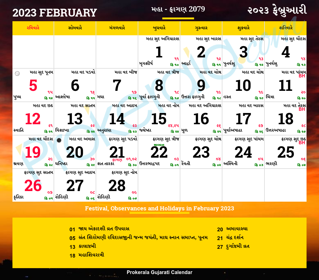 Gujarati Calendar February 2023 Vikram Samvat 2079 Maha Phaguna