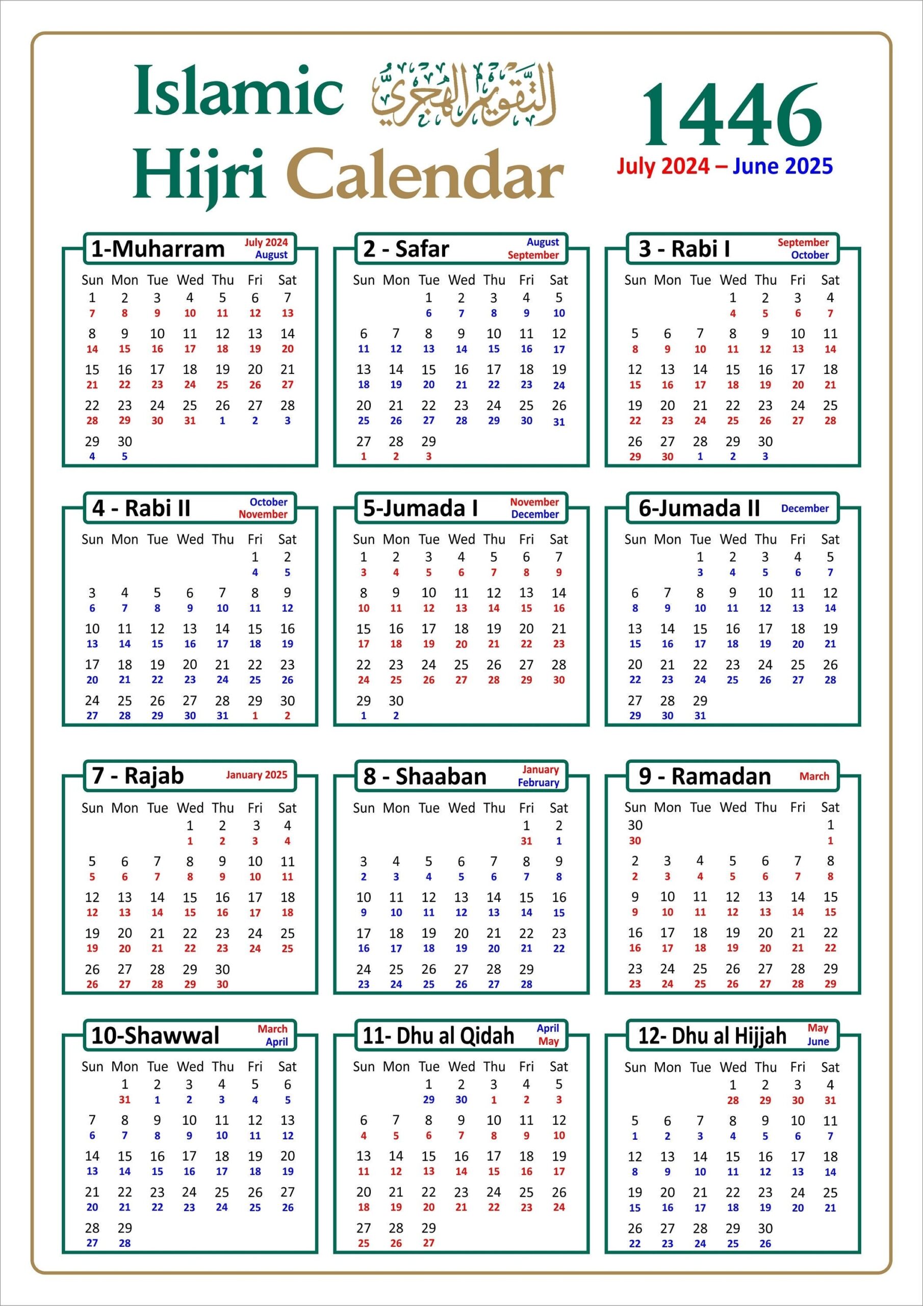 Islamic Hijri Wall Calendar 1446 AH With Colour Coded Gregorian