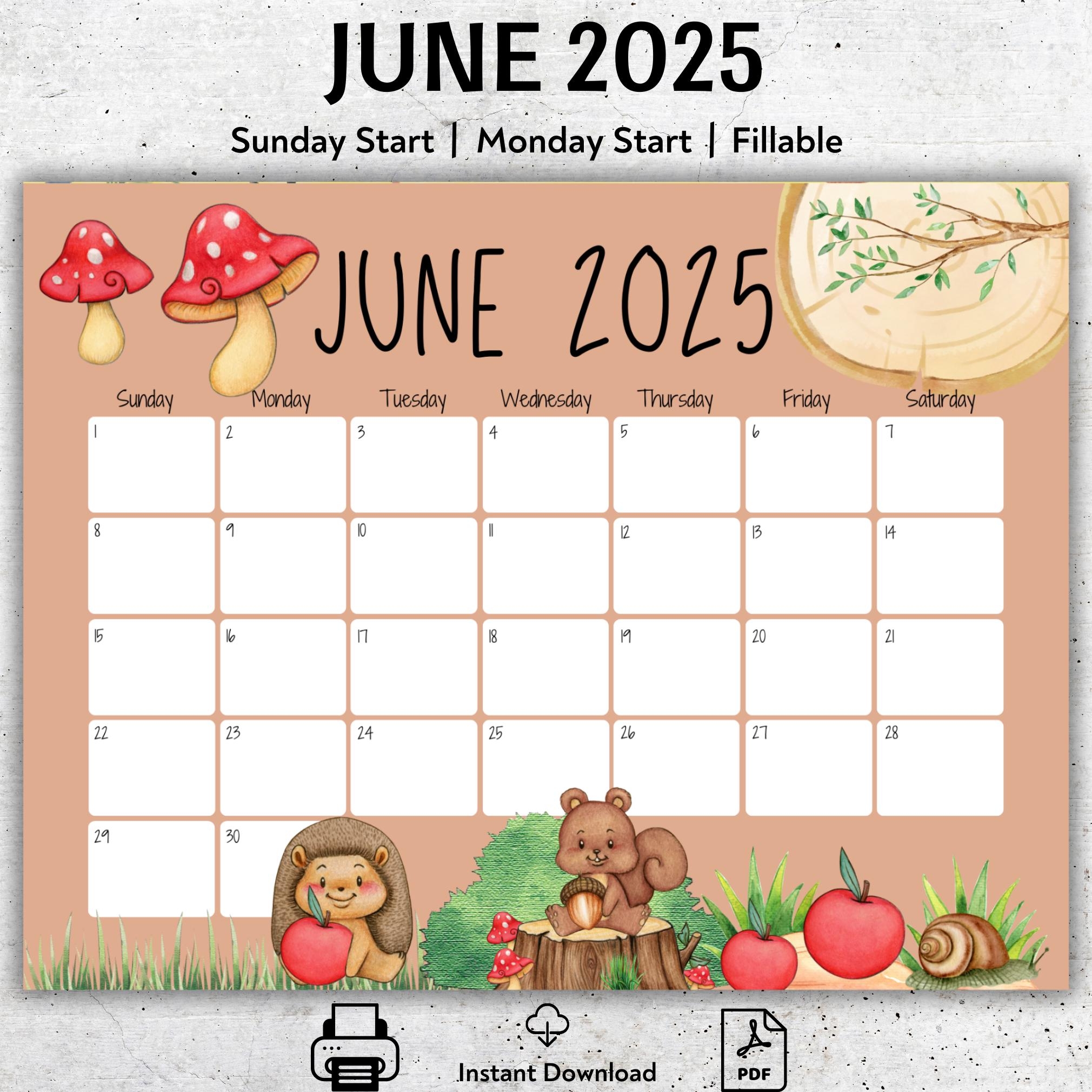 Woodland themed June 2025 Calendar Printable Monthly Planner US