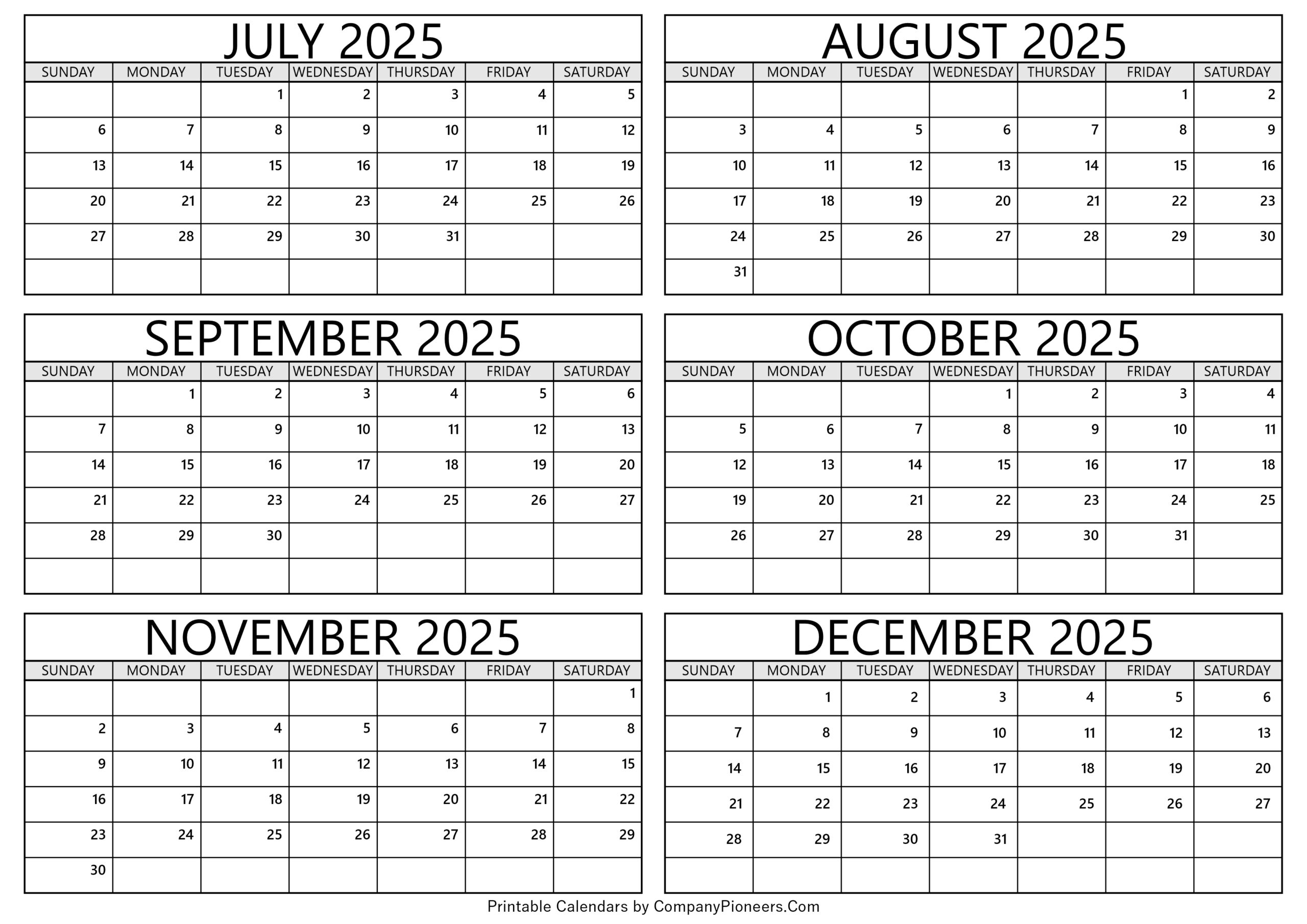 July To December 2025 Calendar Printable PDF Six Months Calendar