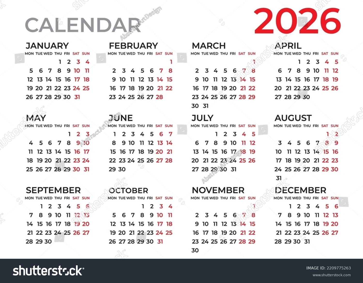 Calendar 2026 Template Planner 2026 Year Stock Vector Royalty