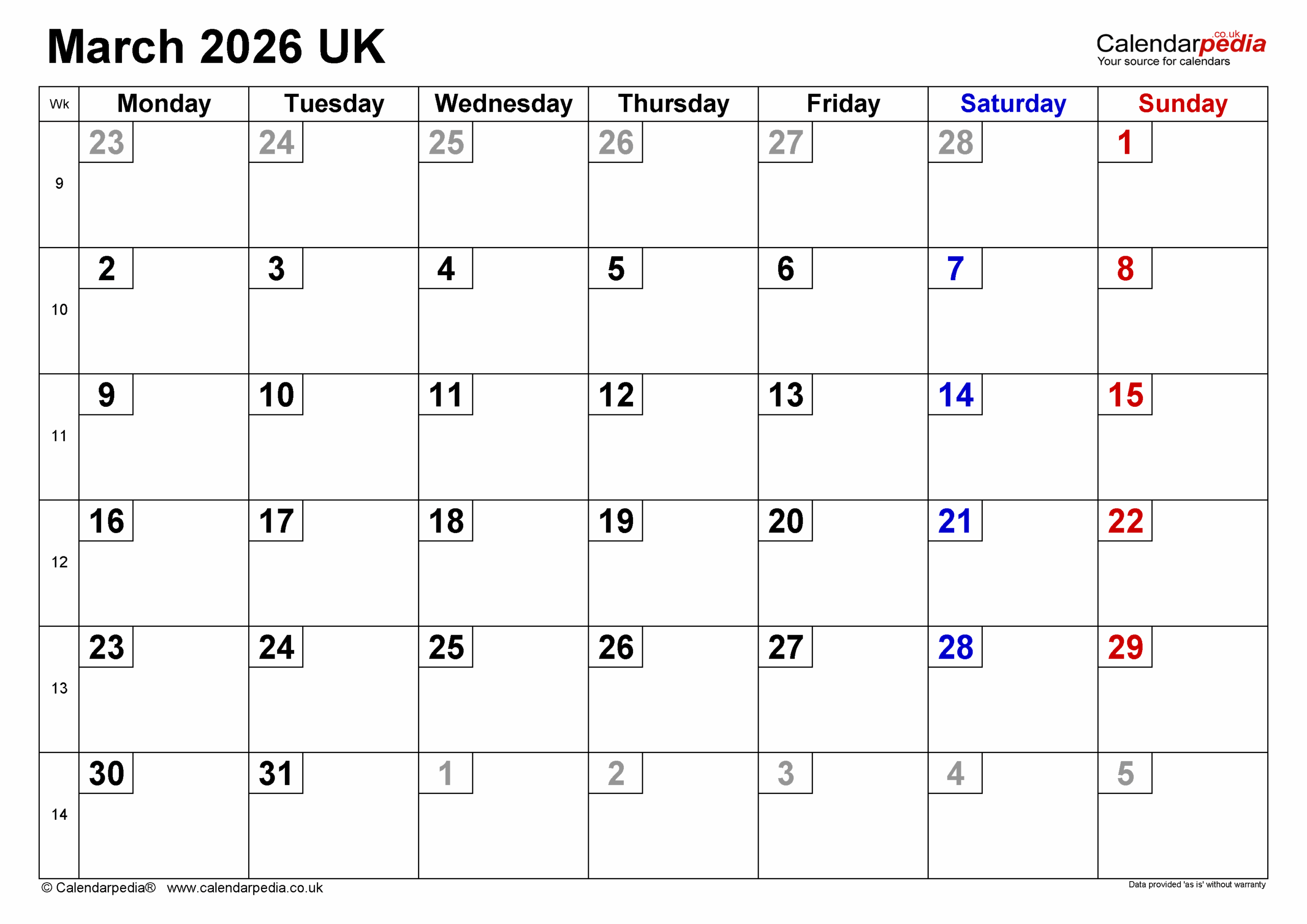 Calendar March 2026 UK With PDF Excel And Word Templates
