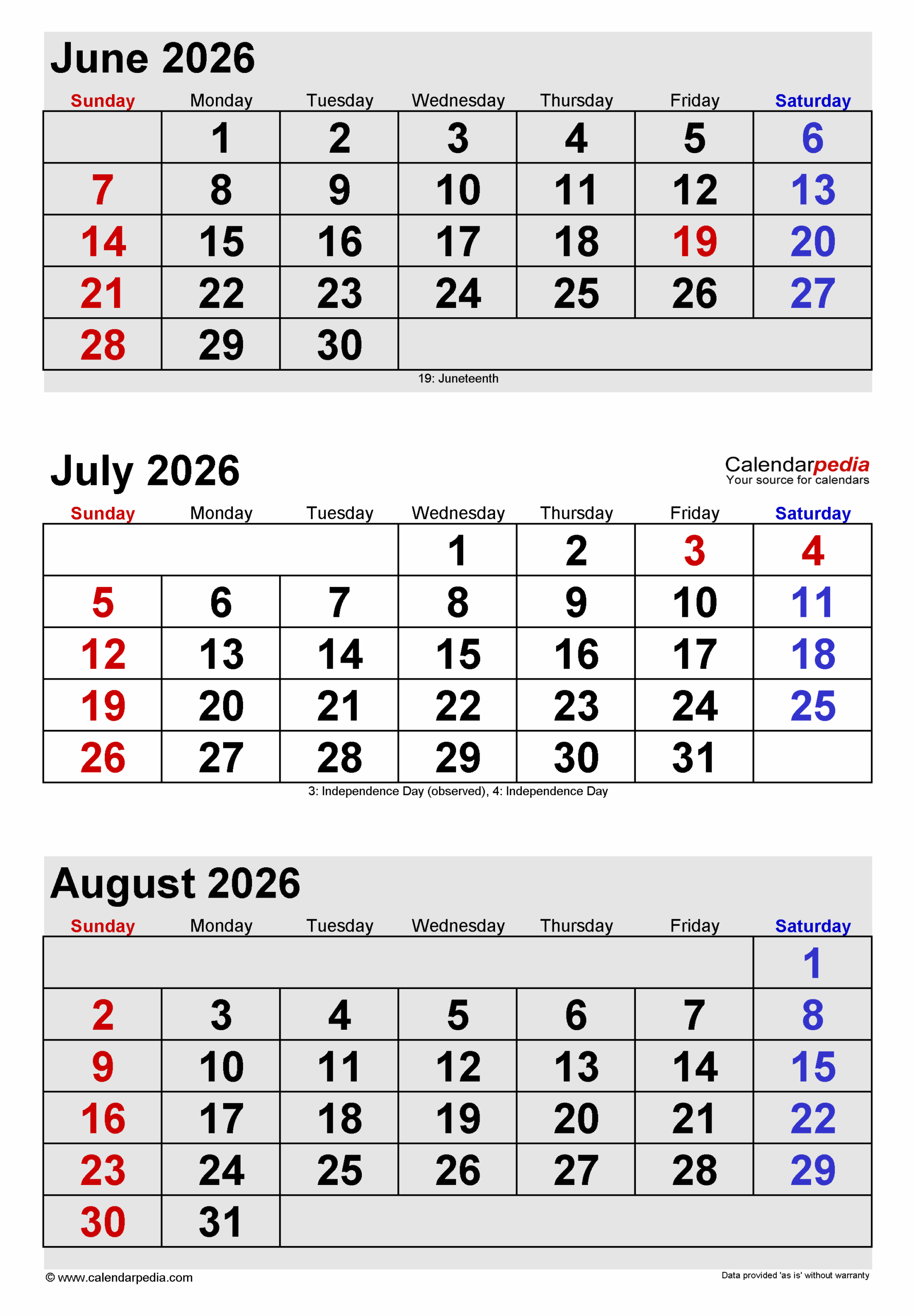 May June July August Calendar 2026