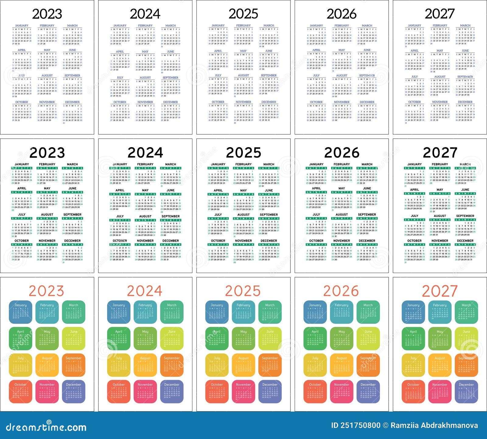 2023 2024 2025 2026 And 2027 Calendar Set Color Vector Calender Design Week Starts On Sunday Stock Vector Illustration Of 2026 Grid 251750800